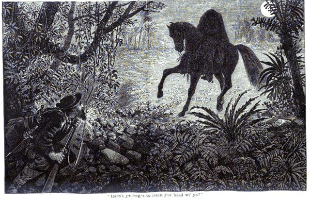 “Clad in flowing black robes, the Dullahan has no head on his shoulders. He carries it with him in his hand, and because he is endowed with supernatural sight, he will hold the head up high. This allows him to see great distances, even on the darkest night.