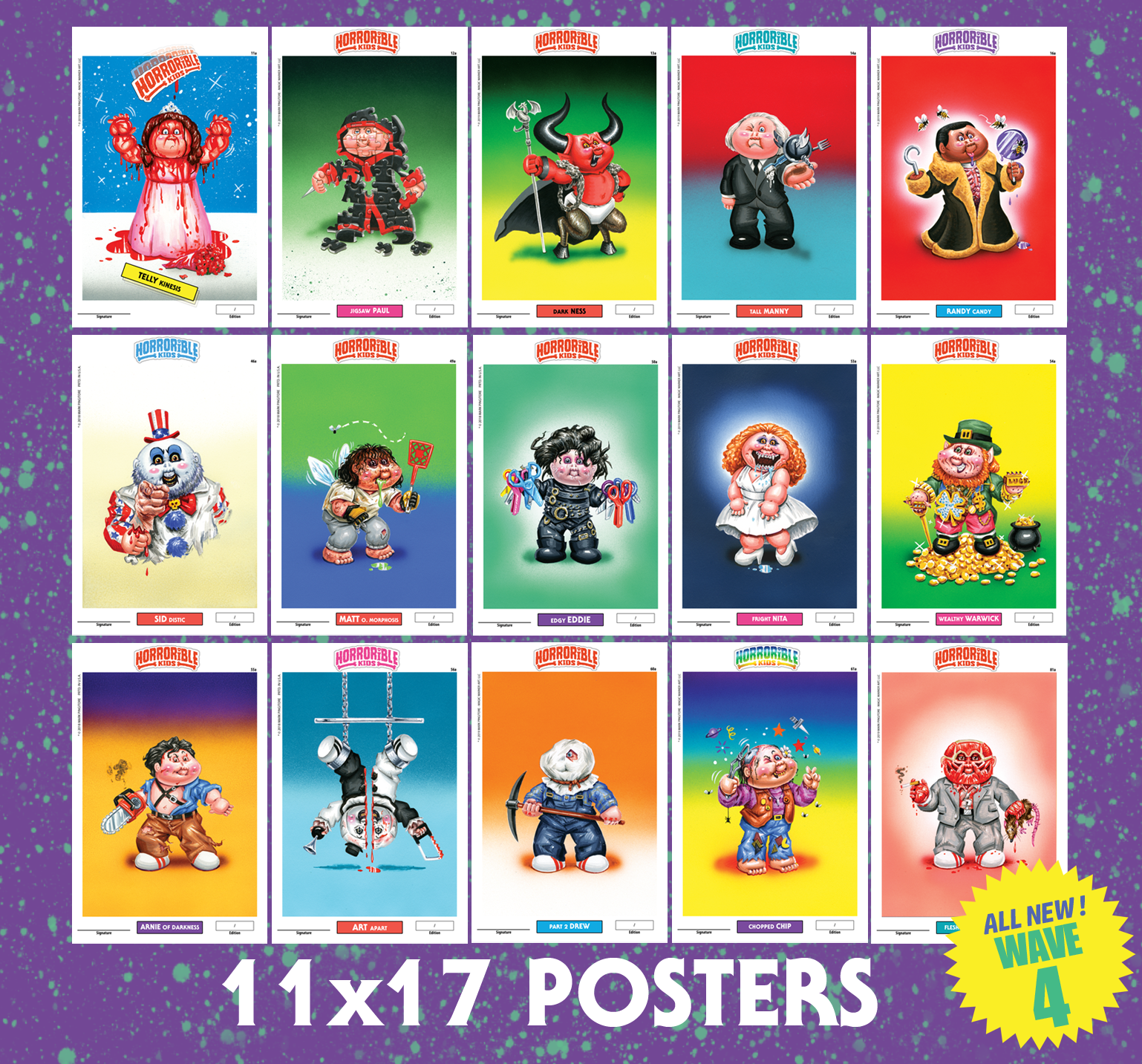 Mark Pingitore, who created artwork for over 100 Garbage Pail Kids card fronts as well as concept work, sketch cards, and paintings for various other trading card series, has released a new series of Garbage Pail Kids characters inspired by horror movies called Horrorible Kids. They are so much fun!