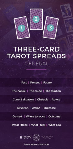 An easy and quick Tarot spread is a three-card layout. Biddy Tarot provides a great list of possible three-card layouts at 25 Easy Three Card Tarot Spreads.