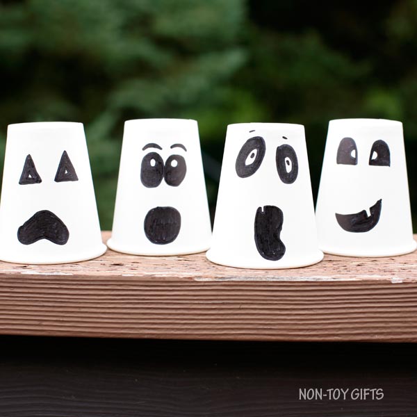 I love the simplicity of this Halloween craft. All you need are some white paper cups and a black marker, which are easy enough to get at a dollar store. Turn the cups upside down, draw goofy ghost faces and—voilà!
