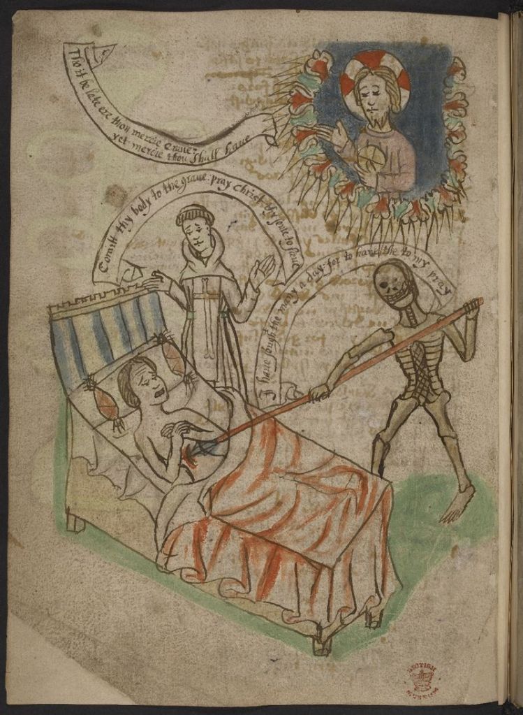An illustration of a medieval “good death.” A man in bed is struck by the figure of Death, while a monk at his side urges him to “pray Christ thy soule to save,” and Christ promises “mercie thou shall have.” The Carthusian Miscellany, England (Yorkshire or Lincolnshire), 1460-1500