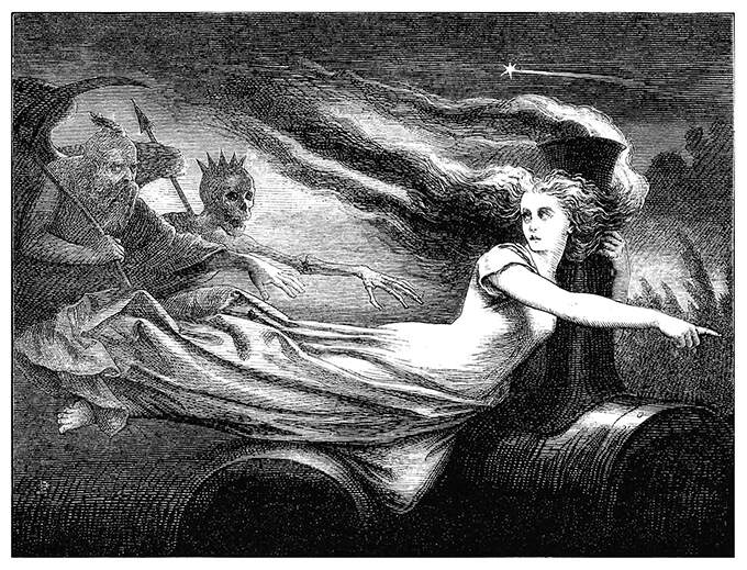 A ghostly female figure floats in the night, one arm wrapped around the chimney of a locomotive, as she points forward and leads the way for the figures of Time and Death following in her wake.