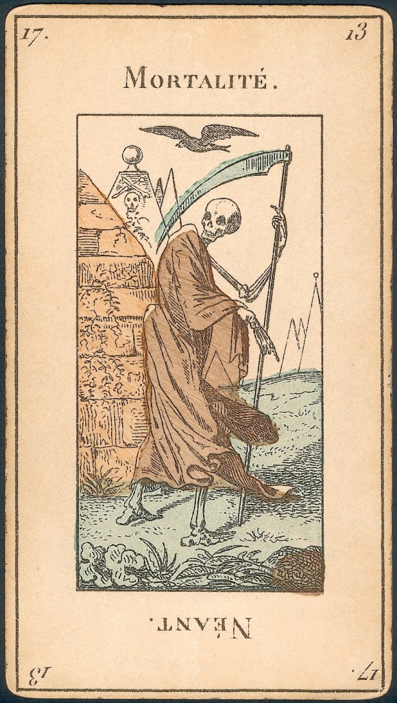 A ghostly female figure floats in the night, one arm wrapped around the chimney of a locomotive, as she points forward and leads the way for the figures of Time and Death following in her wake.