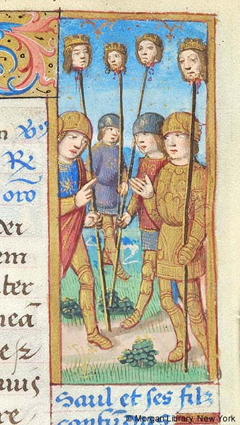 Four soldiers, wearing armor, hold sticks, upon which are heads of Saul and his three sons, all wearing crowns. Scene in landscape setting.Details from Book of Hours, France, ca. 1500, The Morgan Library & Museum.